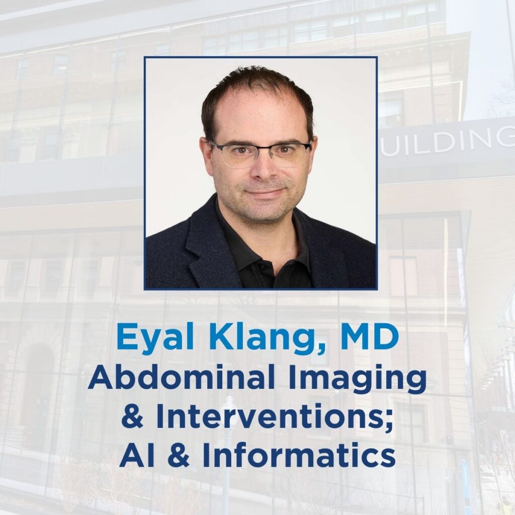 We are delighted to announce that Eyal Klang, MD, has joined our Division of Abdominal Imaging and Interventions on Monday, March 2. Coming to us from Mount Sinai in New York City, Dr. Klang is a nationally recognized expert in informatics and AI, as well as an accomplished and highly specialized radiologist.