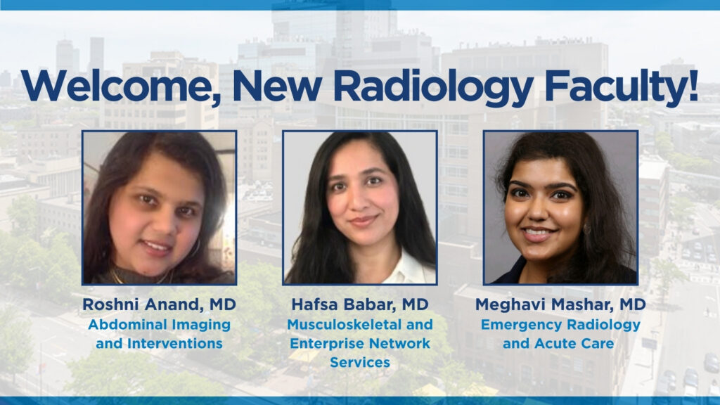 Dr. Roshni Anand joined our Abdominal Imaging and Interventions faculty team in December 2025. Dr. Hafsa Babar joined our Musculoskeletal Imaging and Enterprise Network Services faculty teams in November 2025. Dr. Meghavi Mashar joined our Emergency Radiology / Acute Care faculty team in January 2026.